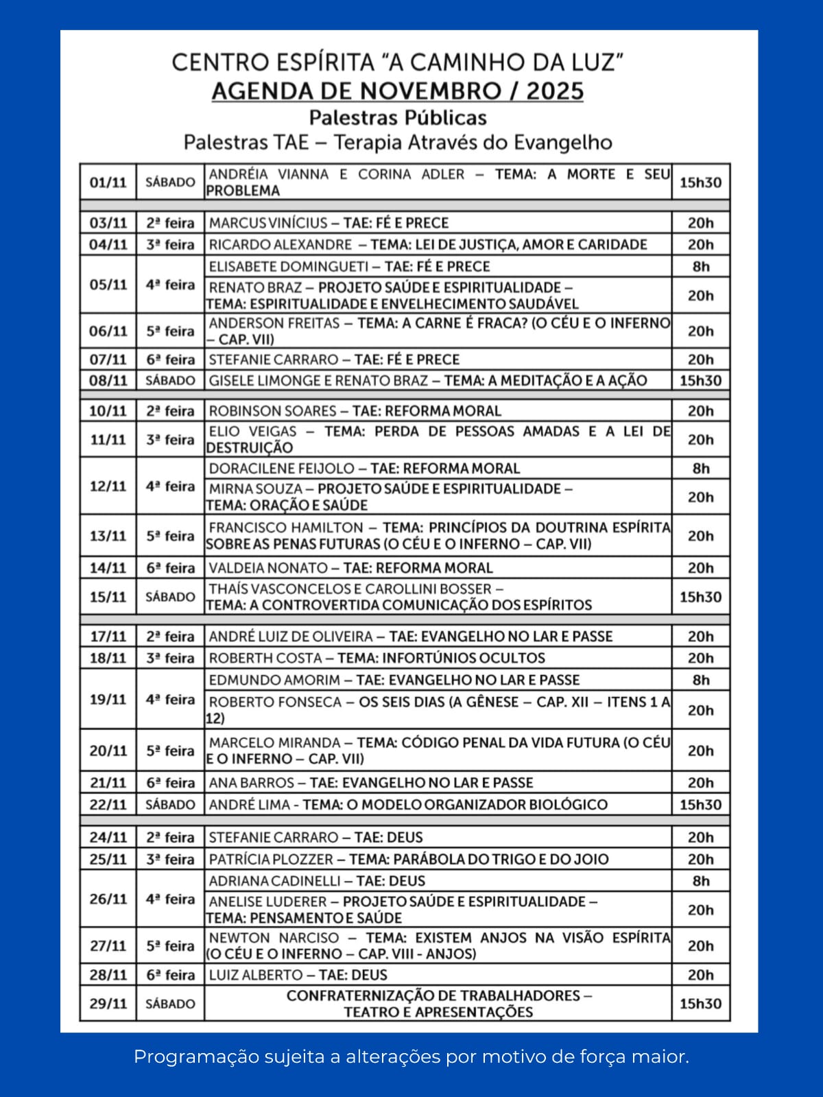 » Caso esteja com sintomas de gripe ou Covid, use máscara protetora, evite aglomerações e prefira assistir a palestra pelo nosso canal no YouTube – https://www.youtube.com/@ceacaminhodaluzvr.